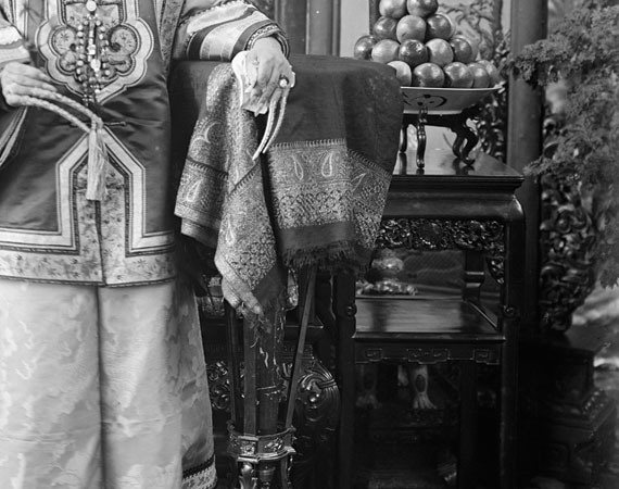 Cixi’s gold filigreed fingernail covers were traditionally worn in the Qing court, as were her “horse-hoof” shoes. While maintaining such conventions, in this image Cixi also included a French Louis XIV pedestal table, upon which rests an embroidered Indian paisley shawl. The arrangement may have refuted her reputation as an insular, xenophobic ruler.