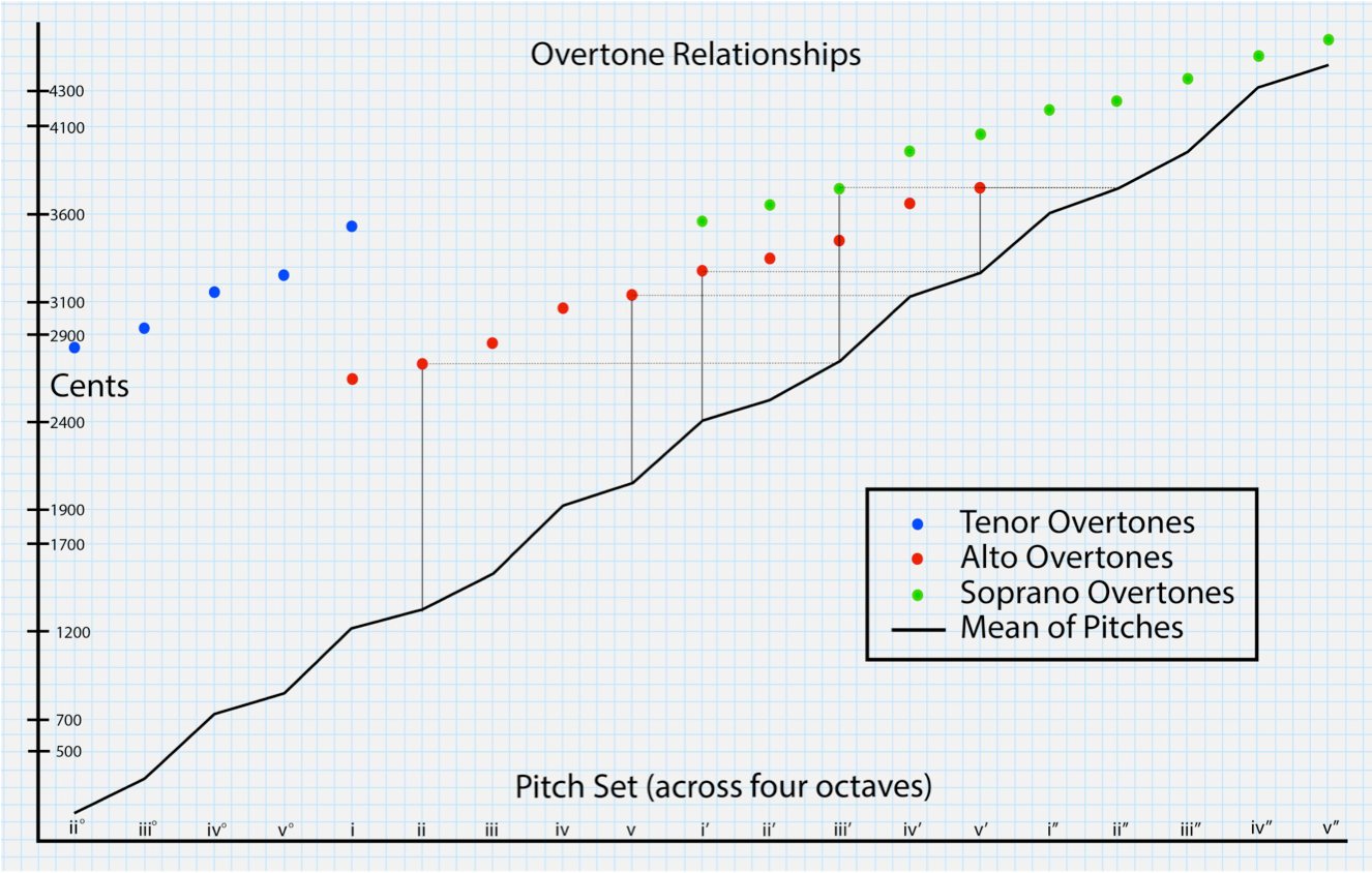 At the unique point where the Tenors and Altos align on pitch, I had an opportunity to highlight the beating cluster between the four unison keys. In keeping with the model of squeezing the octaves in that register, the Tenor pitches at scale degree were tuned sharp from Alto+. This made the relationship between Alto– and Tenor+ the largest unison separation in the whole ensemble. The distance at that point is seventeen Hz, which creates an interval of 43.2 cents and approaches the outer limit for maintaining a scale degree identity between these two unison pitches. The four pitches have markedly different characters and can be presented either as enharmonic unities or as distinct intervals.