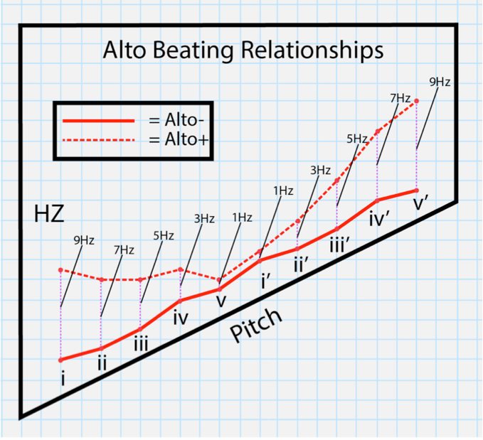 Once the intervals of the pentatonic scale were set and a general treatment of the octaves were determined, my next priority was to devise a model for variation between the beating relationships in paired instruments. The Alto– instrument was the first one to be fine-tuned, so the next instrument to tune was its pair, Alto+.